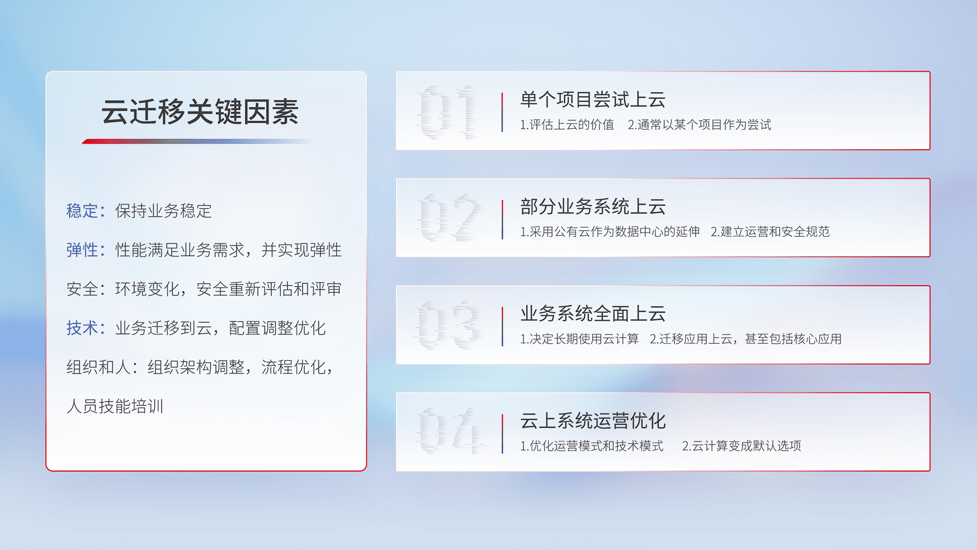 结合实际业务,,从规划设计、、云平台选型、、云原生改造、、、、数据迁移、、、、集成交付,,迁移全过程为客户识别最佳上云路径,,,,做好风险识别管理,,,设计网络架构、、、、身份权限、、安全审计合规、、、操作审计、、日志审计、、、监控告警策略、、多站点容灾设计等,,,,对云上基础设施进行整体规划,,,提升IT治理水平,,,以满足弹性、、高可用、、高性能的需求。。