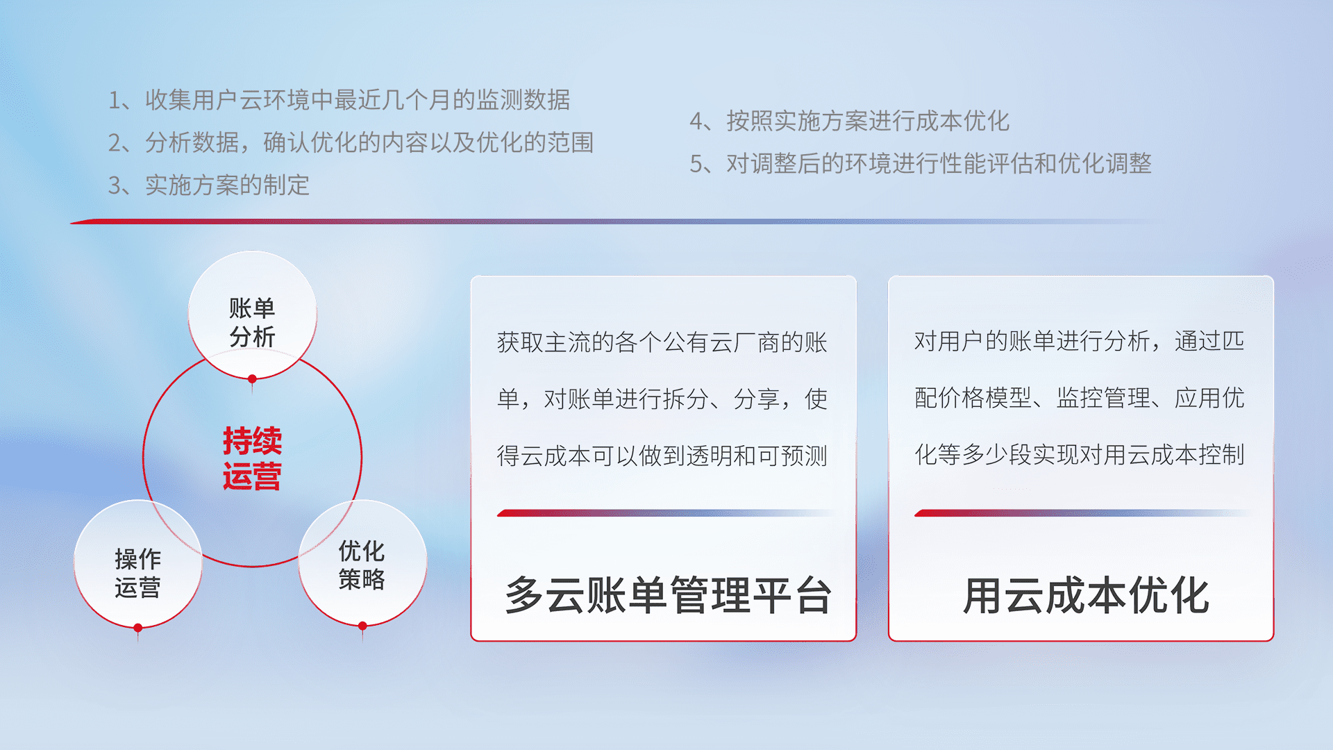 通过多云纳管,,以统一的资源数据模型把客户的云资源进行抽象和封装,,,,进而实现对多云资源的统一操作,,,保障云资源管理的可靠性、、、稳定性与可用性。。。量身定制化运维内容,,,,配置、、、、开发运维、、、补丁管理、、备份、、、、监控、、认证和访问管理、、、、审计和日常巡检等,,保障在用云过程中的可靠度,,稳定度以及高可用率。。。